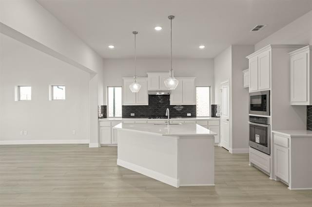 MLS# 20972115 - Built by Pacesetter Homes - Ready Now! ~ Located in the Meadow Run community and zoned to Melissa ISD, 2302 Wheatgrass Way offers a flexible two-story layout with thoughtful design and high-end finishes throughout. The entry opens to luxury vinyl plank flooring that continues through the main living areas and private study which gives you a quiet place to work without feeling closed off. The heart of the home is the open kitchen and family room. The kitchen features white shaker-style cabinets, quartz countertops, a long glossy hex tile backsplash, and GE stainless steel appliances including a built-in oven, microwave, gas cooktop with pot and pan drawers, and dishwasher. A large island with pendant lighting and a pull-out trash drawer adds both function and style. The primary suite is privately located at the back of the home, complete with a large walk-in closet, dual vanities, and a glass-enclosed tile shower with a built-in seat. Two additional bedrooms are downstairs and share a full bath between them, perfect for the kids or guests who dont mind sharing. Upstairs, youll find a spacious gameroom, a third full bathroom, and a private bedroom that works well for a teen or guests. Out back, enjoy a covered patio with a gas drop for a future grill ready for weekend cookouts or relaxing evenings. With upgraded features throughout and a great location in Meadow Run, this home checks all the right boxes for everyday living.?Your Pacesetter Home comes equipped with a suite of smart features!