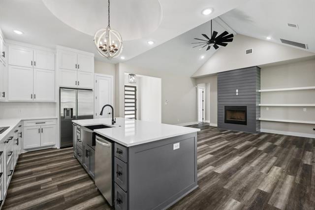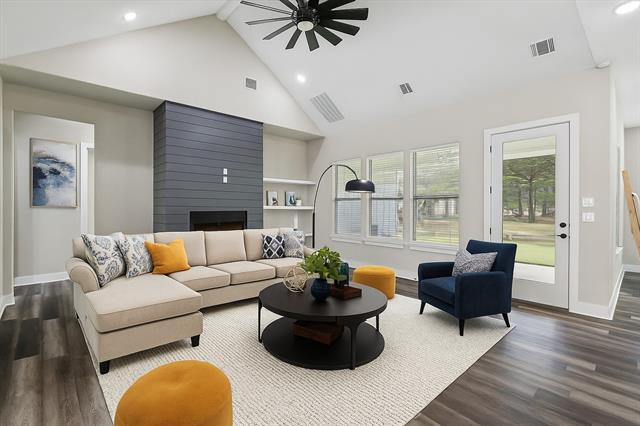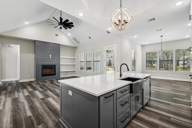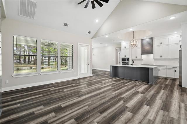 This beautifully crafted home offers 4 bedrooms, 2.5 baths, and a thoughtfully designed layout. The gourmet kitchen features ceiling-height cabinets, quartz countertops and backsplash, stainless steel appliances, a walk-in pantry, and a spacious breakfast island. The open floor plan is highlighted by a soaring vaulted ceiling in the living area, complemented by 10-foot ceilings and 8-foot doors throughout. The split bedroom layout ensures privacy for the serene master suite, which overlooks the backyard and includes a spa-like bath with dual sinks, a free-standing tub, and an expansive walk-in closet that connects directly to the laundry room for convenience. Upstairs, a versatile 5th room with a walk-in closet offers endless options—ideal for a guest suite, home office, or media room. Situated on 1 acre, this property provides plenty of space to build a shop or outdoor retreat. Perfectly located near Highport Marina, you’ll enjoy quick access to all the recreation, beauty, and lifestyle Lake Texoma has to offer!